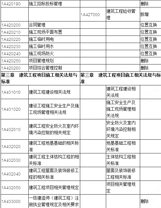 1.刪除“施工招標(biāo)投標(biāo)管理”“項目管理規(guī)劃”“項目綜合管理控制”三節(jié),新增“技術(shù)應(yīng)用管理”“施工商務(wù)管理”和“建筑工程驗收管理”三節(jié),其他小節(jié)位置有調(diào)整。