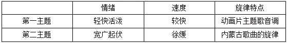 (2)教師總結:本曲的第一主題取材于同名動畫片的主題歌音調,節奏輕快活潑,旋律靈活跳蕩,速度較快,具有舞曲特點。