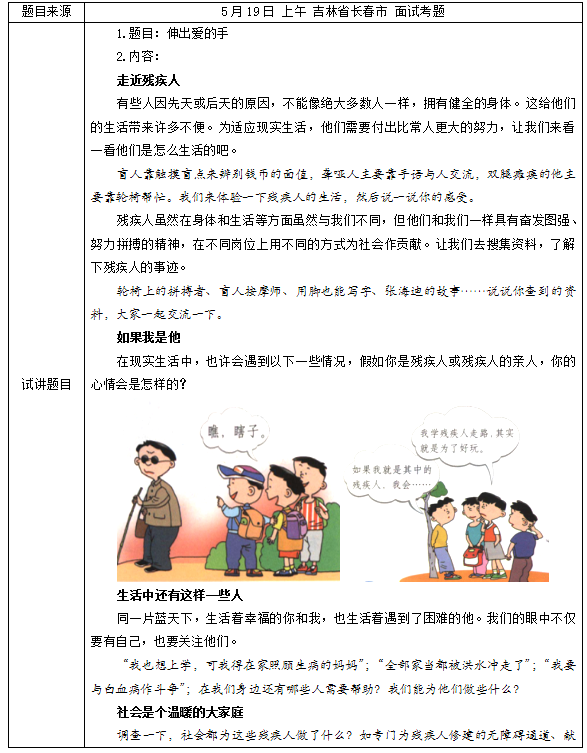 教師根據(jù)學(xué)生的回答進(jìn)行歸納,在面對(duì)這些殘疾人時(shí),我們應(yīng)該平等對(duì)待他們,理解尊重他們,在學(xué)習(xí)和生活上幫助他們,讓他們感受到社會(huì)對(duì)他們的關(guān)愛(ài)。