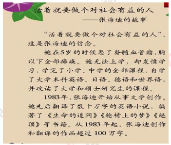 接著,教師請(qǐng)學(xué)生說(shuō)一說(shuō)除了張海迪,你還知道哪些身殘志堅(jiān)的殘疾人?他們有哪些地方值得我們學(xué)習(xí)?學(xué)生交流課前查閱的殘疾人的事跡,如殘奧會(huì)上的運(yùn)動(dòng)員、盲人按摩師等。