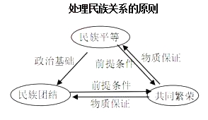 老師總結三個原則的關系:民族平等是實現民族團結的政治基礎,民族平等和民族團結是實現各民族共同繁榮的前提條件。各民族共同繁榮,特別是經濟發展,又是實現民族團結、民族平等的物質基礎。