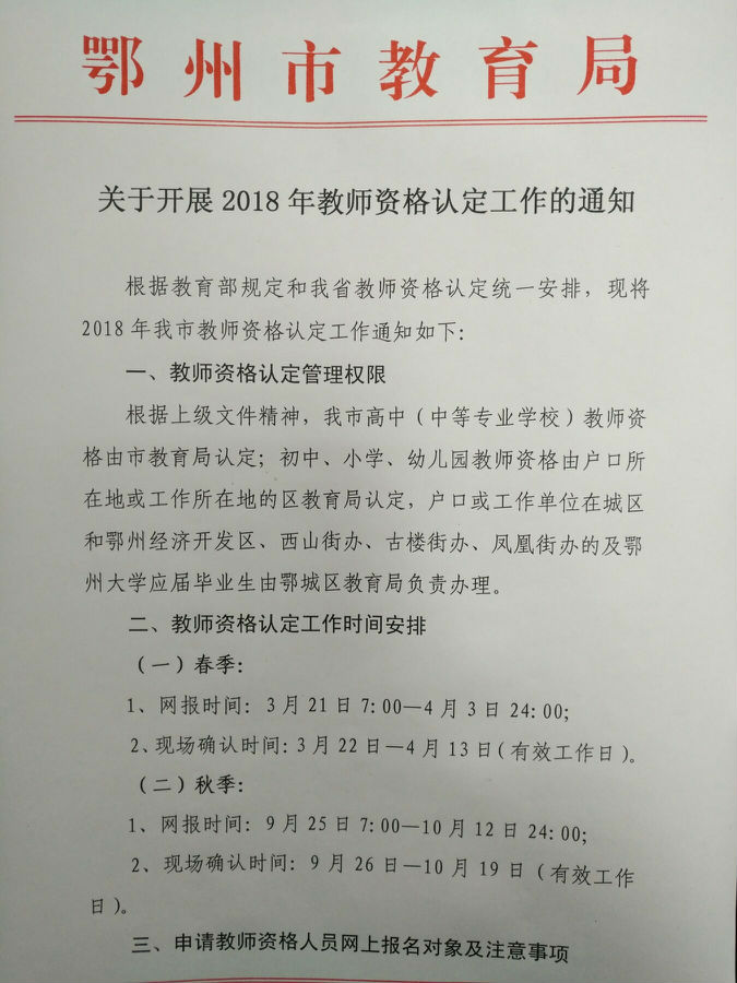 摘要:湖北鄂州市2018年下半年高中教師資格認定網(wǎng)上報名時間9月25日—10月12日,現(xiàn)場確認時間9月26日—10月19日,詳情見下文。