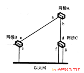 ●如下圖所示,網橋A、B、C連接多個以太網。已知網橋A為根網橋,各個網橋的a、b、f端口為指定端口。那么按照快速生成樹協議標準IEEE 802.1d-2004,網橋B的c端口為(63)。