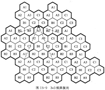 3x3頻率復(fù)用將可用頻率分為9組,標(biāo)為Al,Bl,Cl,A2,B2,C2,A3,B3及C3,分給3個(gè)基站的9個(gè)扇區(qū),如圖15-9所示。3x3頻率復(fù)用通常與基帶跳頻結(jié)合使用,以對(duì)抗由于同頻復(fù)用距離縮短而引起的同頻干擾的增加。