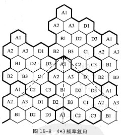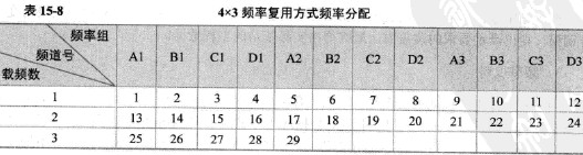 4x3復(fù)用方式把頻率分成12組,并輪流分配到4個(gè)基站,即每個(gè)基站可用到3個(gè)頻率組。這種頻率復(fù)用方式由于復(fù)用距離大,因而能夠比較可靠地滿足GSM體制對(duì)同頻干擾保護(hù)比和鄰頻干擾保護(hù)比指標(biāo)的要求,使GSM網(wǎng)絡(luò)的運(yùn)行質(zhì)量好,安全性好。如圖15-8所示。