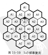 1x3頻率復(fù)用是一種最為緊密的頻率復(fù)用方式,結(jié)合合成器跳頻一起使用,并需同時(shí)采用DTX、功率控制、天線分集等抗干擾技術(shù)。如圖15-10所示。