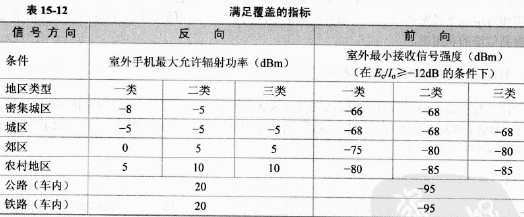 規劃過程中,規劃設計人員在網絡規劃軟件的幫助下,預測規劃區內的每點接收到的信號強度和信號質量,根據預先設定好的覆蓋門限判斷某點是否被覆蓋到,然后對整個規劃區進行統計,確定覆蓋率是否達標。對于CDMA系統,前向鏈路覆蓋標準以E0II0為主,手機接收信號電平為輔:反向鏈路以所需的移動臺發射功率為判斷準則。規劃設計人員在制定相應的覆蓋門限判斷標準時,應當區分不同地區類型,如密集城區、一般城區、郊區、鐵路、公路等,制定相應的標準,表15-12所示是一種描述CDMA系統覆蓋門限的參考參數。