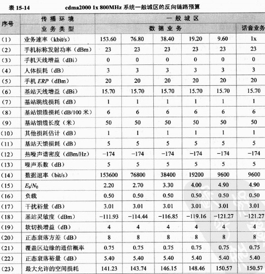 表15-14所示給出了cdma2000lx800MHz系統(tǒng)在一般城區(qū)的反向鏈路預(yù)算表,其中移動(dòng)臺(tái)的有效全向發(fā)射功率為200mW,小區(qū)邊緣覆蓋率為75%,傳播模型為Okumura-Hata模型。對(duì)不同的傳播環(huán)境可采用相應(yīng)的修正因子,實(shí)際的修正因子需通過(guò)模型校正工作得到。