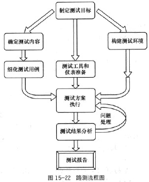 無線網(wǎng)絡關鍵性能指標測試通常通過路測來實現(xiàn)。路測應遵循客觀科學的原則,由制定測 試目標、確定測試內容、細化測試用例、構建測試環(huán)境、準備測試工具和儀表、執(zhí)行測試方案、分析測試結果、問題重現(xiàn)定位、完成測試報告等多個環(huán)節(jié)共同組成。路測流程如圖15-22所示。