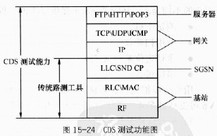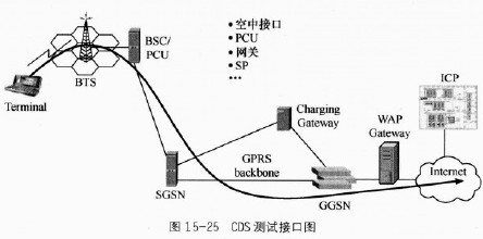 CDS可進行各種業(yè)務(wù)的端到端測試,如彩信、Kjava、WAP,SMS、MMS等,不僅用來解決空中接口無線數(shù)據(jù)業(yè)務(wù)質(zhì)量問題,而且可跟蹤抓包其所有IP層以及其高層的數(shù)據(jù)協(xié)議信息(內(nèi)置數(shù)據(jù)協(xié)議監(jiān)視器),對核心網(wǎng)、網(wǎng)關(guān)、SP問題分析提供幫助,CDS測試接口如圖15-25所示。