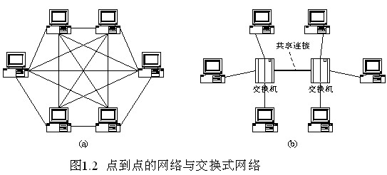 要實現(xiàn)一個通信網(wǎng),最簡單直觀的方案就是在任意兩個用戶之間提供點到點的連接,從而構(gòu)成一個網(wǎng)狀網(wǎng)的結(jié)構(gòu),如圖1.2(a)所示。該方法中每一對用戶之間都需要獨占一個一直的通信線路,通信線路使用的物理媒介可以是銅線、光纖或無線信道。然而該方法并不適用于構(gòu)建大型廣域通信網(wǎng),其主要原因如下: