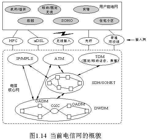 目前,在通信產業界 ,基于IP實現多業務匯聚,骨干網采用MPLS技術和WDM技術來構建已成為共識。隨著相關的標準及技術的發展和成熟,下一代網絡將是基于IP的寬帶綜合業務網。圖1.14描述了目前電信網的概貌。