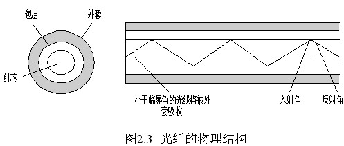 光纖也是一種同軸性結構,由纖芯、包層和外套三個同軸部分組成,其中纖芯、包層由兩種折射率不同的玻璃材料制成,利用光的全反射可以使光信號在纖芯中傳輸, 包層的折射率略小于纖芯,以形成光波導效應,防止光信號外溢。外套一般由塑料制成,用于防止濕氣、磨損和其他環境破壞。其物理結構如圖2.3所示。