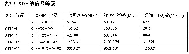 SDH系統中的基本傳輸速率是STM-1(Synchronous Transport Module-1,155.520 Mb/s),其他高階信號速率均由STM-1的整數倍構造而成,例如 STM-4(4×STM-1=622.080 Mb/s),STM-16(4×STM-4=2488.320 Mb/s)等。