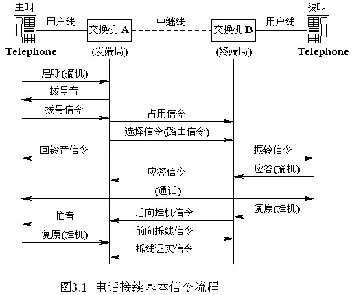 信令系統是通信網的重要組成部分。那么什么是信令呢? 簡單地說,信令是終端和交換機之間以及交換機和交換機之間傳遞的一種信息,這種信息可以指導終端、交換系統、傳輸系統協同運行,在指定的終端間建立和拆除臨時的通信通道,并維護網路本身正常運行。以最簡單的局間電話通信為例,我們可以看一下接續的基本信令流程,見圖3.1。
