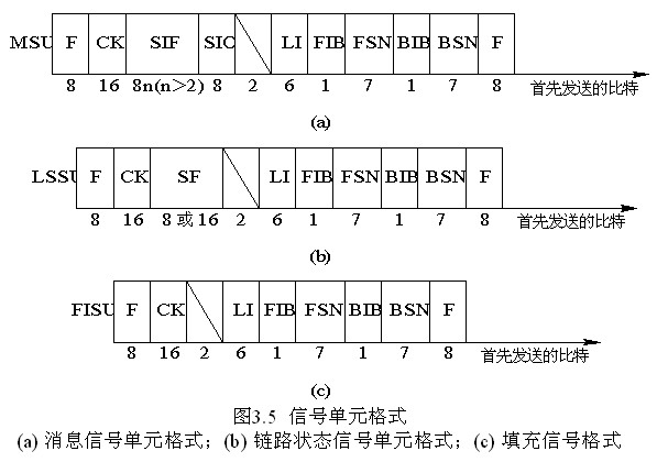 為適應信令網中各種信令信息的傳送要求,No.7信令方式在MTP第二級規定了三種基本的信號單元格式。它們是消息信號單元(MSU:Message Signal Unit)、鏈路狀態信號單元(LSSU:Link Status Signal Unit)和填充信號單元(FISU:Fill-in Signal Unit)。