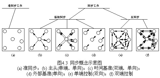 (3) 單端控制:節(jié)點時鐘的同步控制信號來自輸入時鐘信號和本地時鐘信號的差值,也就是來自節(jié)點的本端。圖4.3(b)的主從同步必然是單端的,圖4.3(e)所示為單端互同步方式。