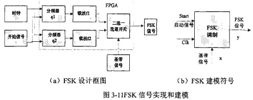 分頻器1、2分別用于產生載頻f1、f2,然后在基帶信號的控制下通過選通開關。即當基帶信號為“1”時,選通載波f2;基帶信號為“0”時,選通載波設計思想見圖3-20。當開始信號為“1”時,進行FSK調制,ql對時鐘12分頻;q2對時鐘2分頻;基帶信號隨機產生。