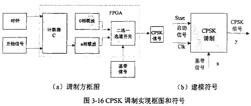 框圖和設(shè)計(jì)符號(hào)如圖3-16所示。CPSK調(diào)制器模型主要由計(jì)數(shù)器和二選一開(kāi)關(guān)等組成。計(jì)數(shù)器用于對(duì)時(shí)鐘信號(hào)的分頻與計(jì)數(shù),并輸出兩路相位相反的數(shù)字載波信號(hào);在基帶信號(hào)的控制下,對(duì)兩路信號(hào)進(jìn)行選通,輸出即為CPSK信號(hào)。