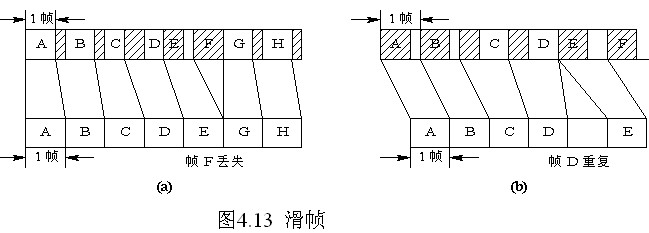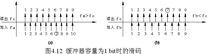 當緩沖器的容量為1 bit時,滑碼一次丟失或增加的碼元數為1 bit,這時將引起幀失步,從而造成在失步期間全部信息碼元的丟失。解決的方法是擴大緩沖器的容量。圖4.13是緩沖器的容量為1幀時滑碼產生的情況。圖4.13中,f a>f c,即對于緩沖器是寫得快而讀得慢,緩沖器存儲的碼元逐漸增加,當增加至一幀時,將產生一次滑碼,從而丟失1幀的碼元。圖4.13(b)是f b<f c的情況,這時滑碼一次,碼元將增加1幀。
