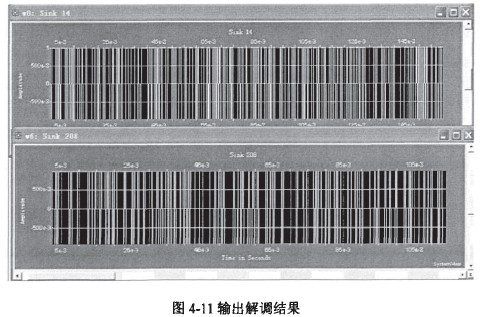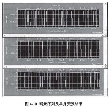 運行系統得到碼元序列及串并變換結果及最后輸出解調結果如圖4-10和圖4-11所本: