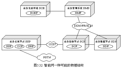 物理平面(PP:Physical Plane)描述了分布功能平面中的功能實體可以在哪些物理節點中實現。一個物理節點可以包含一個到多個功能實體,但一個功能實體只能位于一個節點中。此處的物理節點就是前面介紹的SSP、SCP、IP、SMS等。一種可能的物理結構如圖5.32所示。智能網中,SCP與SMS、SMS與SCE間,使用X.25/FR/DDN數據鏈路傳遞信息,而SCP與SSP、SCP與IP(實現SRF功能)間則使用No.7信令數據鏈路傳遞信息。要注意的是,SCP與SSP、IP之間傳遞的是電路無關信令消息,采用INAP;而SSP與IP之間傳遞的是電路相關信令消息,故可使用ISUP,實際中,如果SSP與IP合設,則SSP與IP之間可以采用內部接口。