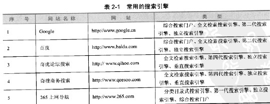常用的搜索引擎:如表2-1所示。