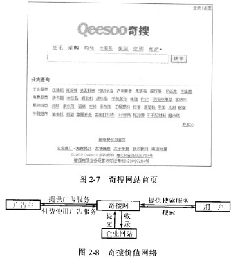 奇搜商務(wù)搜索的價(jià)值網(wǎng)絡(luò)以奇搜網(wǎng)為核心,涉及奇搜提供的搜索服務(wù)、使用奇搜搜索服務(wù)的用戶(hù)、奇搜提供的廣告服務(wù)、購(gòu)買(mǎi)奇搜廣告服務(wù)的廣告主、被奇搜收采的企業(yè)網(wǎng)站,它們之間的關(guān)系,如圖2-8所示,如圖2-7所示。