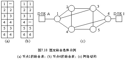 下面給出固定路由表算法的例子。圖7.18(c)為網(wǎng)絡(luò)結(jié)構(gòu),表7.4為網(wǎng)絡(luò)控制中心計(jì)算得到的全網(wǎng)的路由表。該表列出了所有節(jié)點(diǎn)到各個(gè)目的節(jié)點(diǎn)所確定的發(fā)送路由。實(shí)際上,對(duì)于每一個(gè)網(wǎng)絡(luò)節(jié)點(diǎn)僅需存儲(chǔ)其中相應(yīng)的一列即可。圖7.18(a)、(b)分別為節(jié)點(diǎn)1和節(jié)點(diǎn)4的路由表。