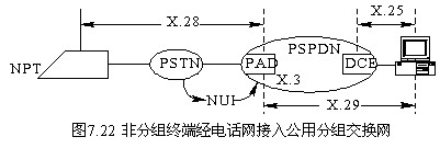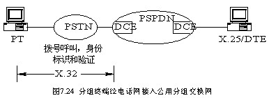 分組終端接入分組網時,按照ITU-T X.32建議標準進行操作,如圖7.24所示。