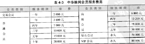 一是會員服務(wù)收入,即交納的會員費(fèi)、交易資格金及交易保證金等費(fèi)用;二是交易手續(xù)費(fèi),買賣雙方需按事先約定的比例向中華糧網(wǎng)繳納交易手續(xù)費(fèi)。其會員費(fèi)如表4-3所示。