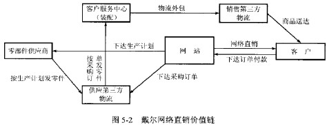 在戴爾網絡直銷商務模式中,涉及的利益相關者主要包括零部件供應商、客戶服務中心、供應第三方物流、銷售第三方物流和客戶,其價值鏈如圖5-2所示。