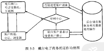 通過(guò)戴爾的電子商務(wù)網(wǎng)上平臺(tái),客戶可以很輕松地完成資料查詢、服務(wù)咨詢、提交購(gòu)物笮、提出問(wèn)題或建議,當(dāng)然還冇投訴。如果把電話接受業(yè)務(wù)--這一更廣義的電子商務(wù)包括在內(nèi),戴爾提供了各種服務(wù)熱線的800免費(fèi)服務(wù)電話,用戶同樣可以用電?和戴爾聯(lián)系業(yè)務(wù),取得服務(wù)等,這也是戴爾在全力推廣基于Internet電子直銷業(yè)務(wù)的同時(shí)與傳統(tǒng)的商業(yè)運(yùn)行模式保持一定聯(lián)系的體現(xiàn)。基于戴爾電子商務(wù)的網(wǎng)上系統(tǒng)與電話業(yè)務(wù),客戶與戴爾的溝通可以用圖5-3這個(gè)簡(jiǎn)單的框架圖反映出來(lái)。