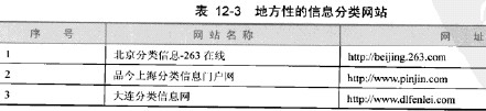 區域性信息分類網站是指網站上的信息來源僅僅是某個特定的E域和地R,并且此網站的經營范圍也就是這些信息的來源地K。目前,影響比較人的地方性信息分類網站,如表12-3所示。
