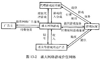 盛人網絡游戲的價值網絡以盛大網絡游戲為核心,涉及盛人網絡自主開發和代理運營的網絡游戲、衍生出的道具和游戲指南等周邊產品、網絡游戲玩家、代理運營盛大網絡游戲的網絡游戲運營商、盛大M絡游戲中提供的網絡廣告服務、購買盛大網絡廣n的廣告主,它們之間的關系如圖13-2所示。