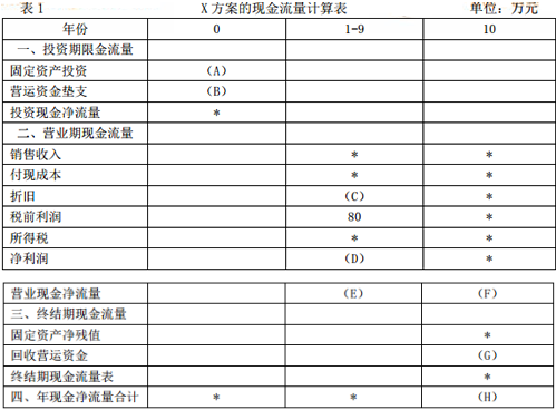 資料二:X方案需要投資固定資產500萬元,不需要安裝就可以使用,預計使用壽命為10年,期滿無殘值,采用直線法計算折舊,該項目投產后預計會使公司的存貨和應收賬款共增加20萬元,應付賬款增加5萬元。假設不會增加其他流動資產和流動負債。在項目運營的10年中,預計每年為公司增加稅前利潤80萬元。X方案的現金流量如表1所示。