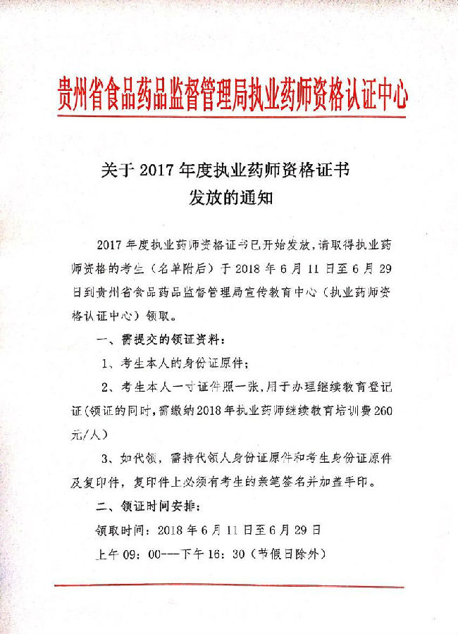 摘要:根據2017年貴州執業藥師證書發放通知,2017年貴州執業藥師證書領取時間6月11日-29日,領取地點:貴陽市云巖區陜西路123號。